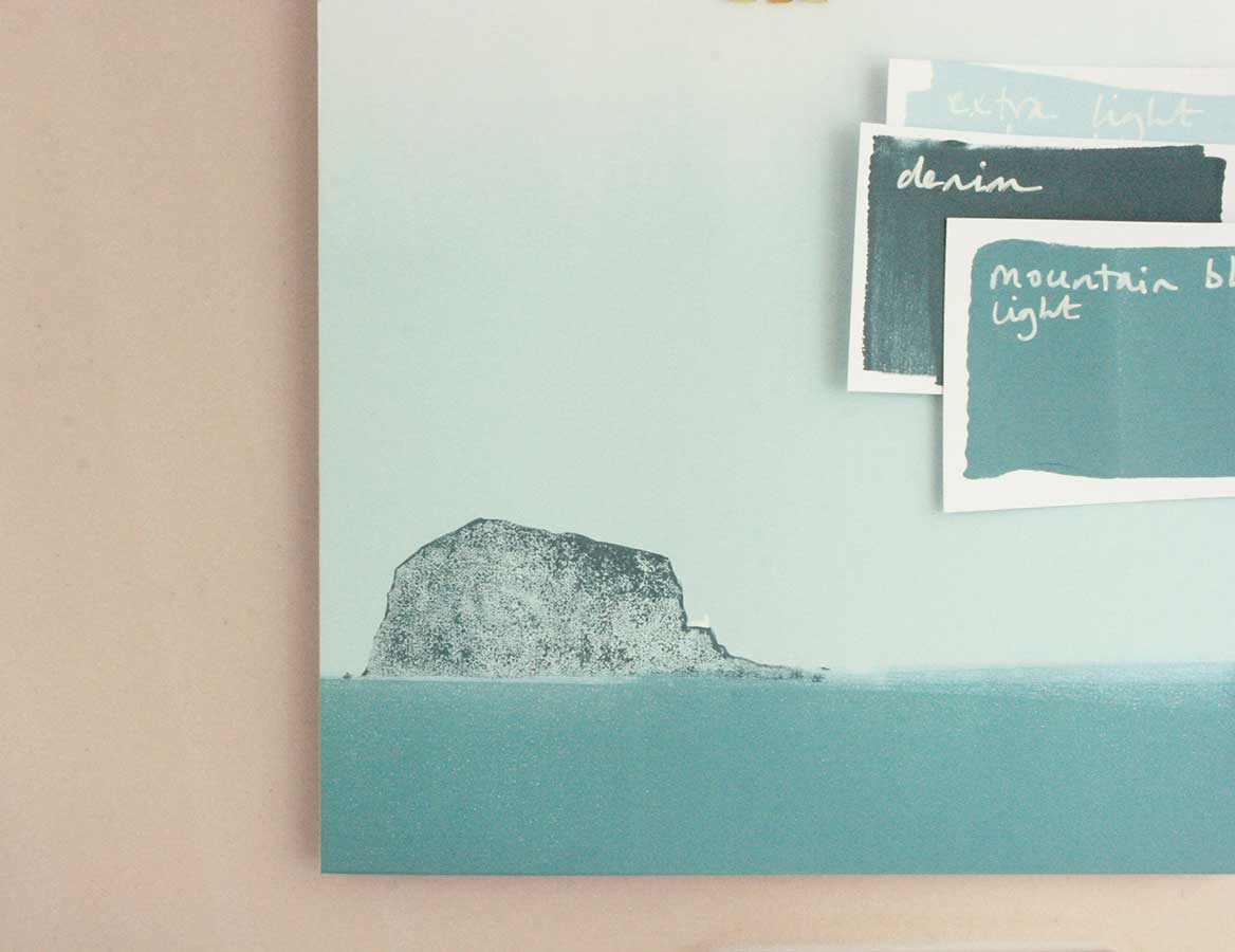 So when we got home, I began re-inventing the original print to try and capture the softness of the light as well as the un-forgiving mass that is the Bass Rock.